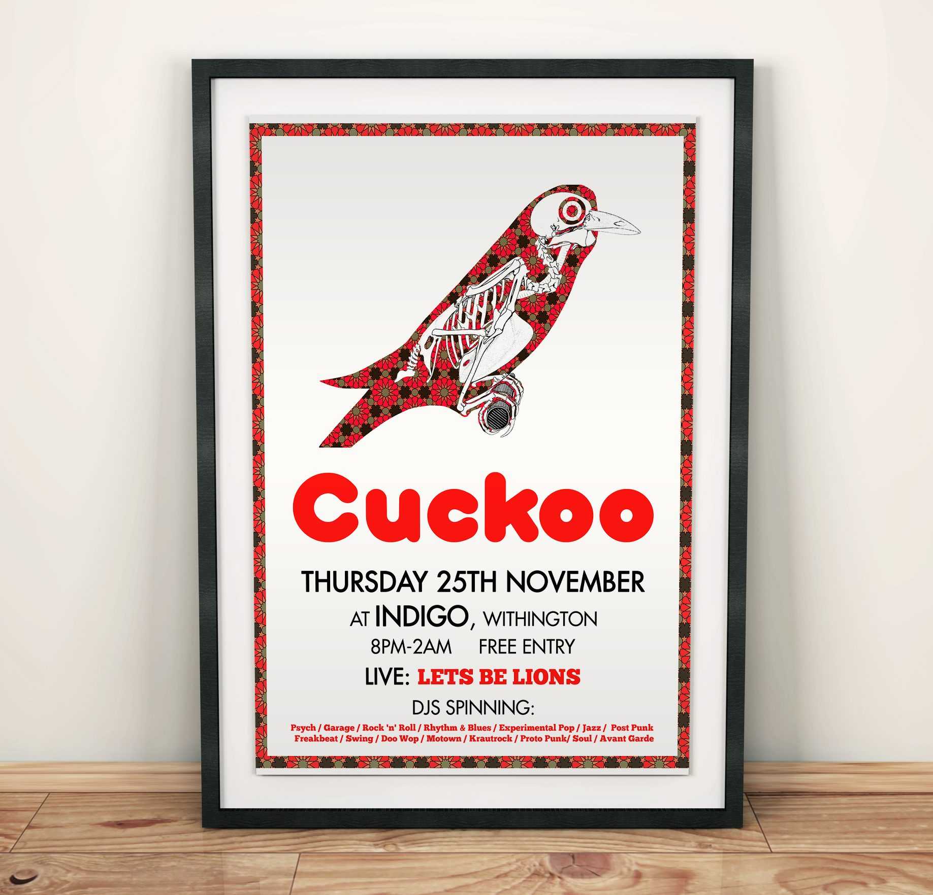 I wanted to allude to the name and settled on a skeletal bird with its typical outline made of a pattern which could be swapped out each time they needed a new poster.